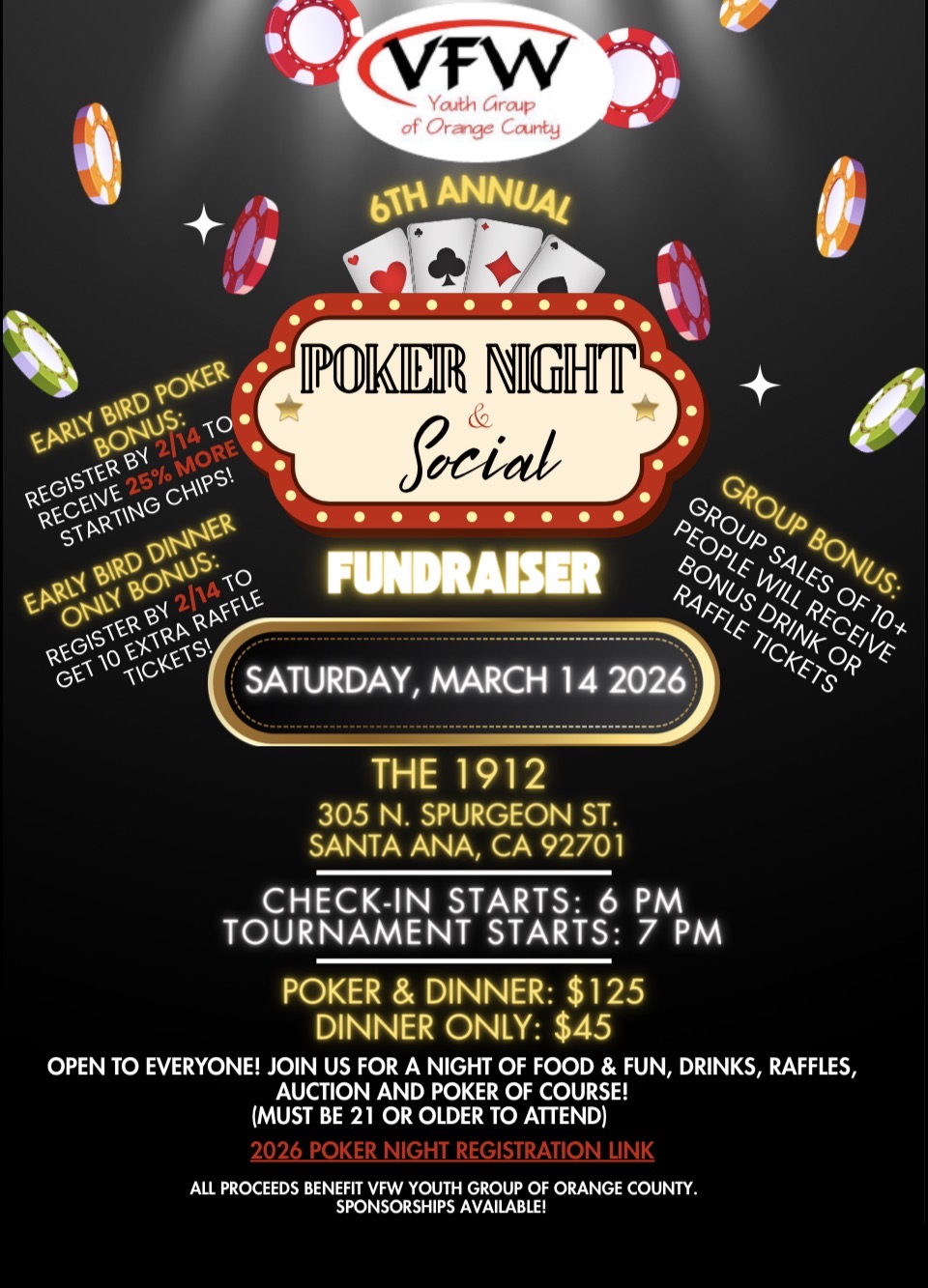 Please join us on March 14th, 2026 to help raise funds for our VFW Youth Group Senior Scholarships Awards. Open To Everyone! Join us for a night of food & fun,