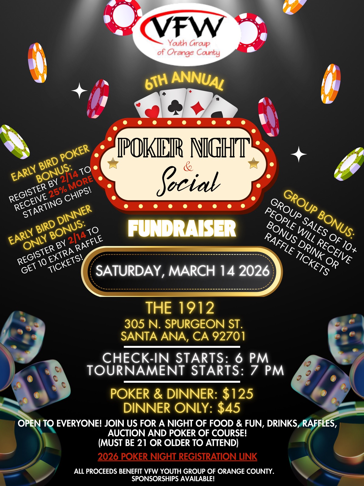 Please join us on March 14th, 2026 to help raise funds for our VFW Youth Group Senior Scholarships Awards. Open To Everyone! Join us for a night of food & fun,