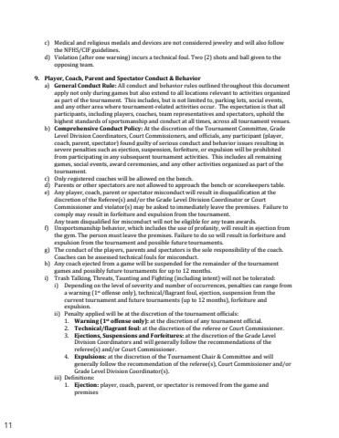 11c) Medical and religious medals and devices are not considered jewelry and will also follow the NFHS/CIF guidelines. d) Violation (after one warning) incurs a technical foul. Two (2) shots and ball given to the opposing team. 9. Player, Coach, Parent and Spectator Conduct & Behavior a) General Conduct Rule: All conduct and behavior rules outlined throughout this document apply not only during games but also extend to all locations relevant to activities organized as part of the tournament. This includes, but is not limited to, parking lots, social events, and any other area where tournament-related activities occur. The expectation is that all participants, including players, coaches, team representatives and spectators, uphold the highest standards of sportsmanship and conduct at all times, across all tournament venues. b) Comprehensive Conduct Policy: At the discretion of the Tournament Committee, Grade Level Division Coordinators, Court Commissioners, and officials, any participant (player, coach, parent, spectator) found guilty of serious conduct and behavior issues resulting in severe penalties such as ejection, suspension, forfeiture, or expulsion will be prohibited from participating in any subsequent tournament activities. This includes all remaining games, social events, award ceremonies, and any other activities organized as part of the tournament. c) Only registered coaches will be allowed on the bench. d) Parents or other spectators are not allowed to approach the bench or scorekeepers table. e) Any player, coach, parent or spectator misconduct will result in disqualification at the discretion of the Referee(s) and/or the Grade Level Division Coordinator or Court Commissioner and violator(s) may be asked to immediately leave the premises. Failure to comply may result in forfeiture and expulsion from the tournament. Any team disqualified for misconduct will not be eligible for any team awards. f) Unsportsmanship behavior, which includes the use of profanity, will result in ejection from the gym. The person must leave the premises. Failure to do so will result in forfeiture and expulsion from the tournament and possible future tournaments. g) The conduct of the players, parents and spectators is the sole responsibility of the coach. Coaches can be assessed technical fouls for misconduct. h) Any coach ejected from a game will be suspended for the remainder of the tournament games and possibly future tournaments for up to 12 months. i) Trash Talking, Threats, Taunting and Fighting (including intent) will not be tolerated: i) Depending on the level of severity and number of occurrences, penalties can range from a warning (1st offense only), technical/flagrant foul, ejection, suspension from the current tournament and future tournaments (up to 12 months), forfeiture and expulsion. ii) Penalty applied will be at the discretion of the tournament officials: 1. Warning (1st offense only): at the discretion of any tournament official. 2. Technical/flagrant foul: at the discretion of the referee or Court Commissioner. 3. Ejections, Suspensions and Forfeitures: at the discretion of the Grade Level Division Coordinators and will generally follow the recommendations of the referee(s) and/or Court Commissioner. 4. Expulsions: at the discretion of the Tournament Chair & Committee and will generally follow the recommendation of the referee(s), Court Commissioner and/or Grade Level Division Coordinator(s). iii) Definitions: 1. Ejection: player, coach, parent, or spectator is removed from the game and premises