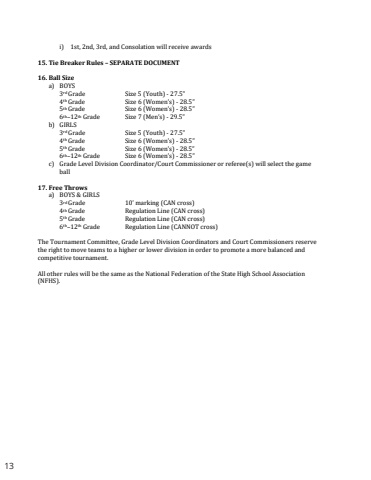 13i) 1st, 2nd, 3rd, and Consolation will receive awards 15. Tie Breaker Rules %u2013 SEPARATE DOCUMENT 16. Ball Size a) BOYS 3rd Grade Size 5 (Youth) - 27.5%u201d 4th Grade Size 6 (Women%u2019s) - 28.5%u201d 5th Grade Size 6 (Women%u2019s) - 28.5%u201d 6th%u201312th Grade Size 7 (Men%u2019s) - 29.5%u201d b) GIRLS 3rd Grade Size 5 (Youth) - 27.5%u201d 4th Grade Size 6 (Women%u2019s) - 28.5%u201d 5th Grade Size 6 (Women%u2019s) - 28.5%u201d 6th%u201312th Grade Size 6 (Women%u2019s) - 28.5%u201d c) Grade Level Division Coordinator/Court Commissioner or referee(s) will select the game ball 17. Free Throws a) BOYS & GIRLS 3rd Grade 10%u2019 marking (CAN cross) 4th Grade Regulation Line (CAN cross) 5th Grade Regulation Line (CAN cross) 6th%u201312th Grade Regulation Line (CANNOT cross) The Tournament Committee, Grade Level Division Coordinators and Court Commissioners reserve the right to move teams to a higher or lower division in order to promote a more balanced and competitive tournament. All other rules will be the same as the National Federation of the State High School Association (NFHS).