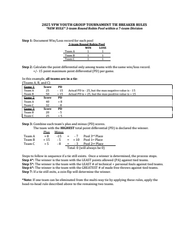 2025 VFW YOUTH GROUP TOURNAMENT TIE BREAKER RULES *NEW RULE* 3-team Round Robin Pool within a 7-team Division Step 1: Document Win/Loss record for each pool 3-team Round Robin Pool WIN LOSSTeam A 1 1 Team B 1 1 Team C 1 1 Step 2: Calculate the point differential only among teams with the same win/loss record. +/- 15 point maximum point differential (PD) per game. In this example, all teams are in a tie: (Teams A, B, and C) Game 1 Score PD Team A 25 - 15 Actual PD is - 25, but the max negative value is - 15Team B 50 + 15 Actual PD is + 25, but the max positive value is + 15 Game 2 Score PD Team A 40 + 8 Team C 32 - 8Game 3 Score PDTeam B 20 - 5 Team C 25 + 5 Step 3: Combine each team%u2019s plus and minus (PD) scores. The team with the HIGHEST total point differential (PD) is declared the winner. Plus Minus Team A + 8 -15 = - 7 Pool 3rd Place Team B + 15 - 5 = + 10 Pool 1st Place Team C + 5 - 8 = - 3 Pool 2nd Place Total: 0 (will always be 0) Steps to follow in sequence if a tie still exists. Once a winner is determined, the process stops. Step 4*: The winner is the team with the LEAST points allowed (PA) against tied teams. Step 5*: The winner is the team with the LEAST # of technical + personal fouls against tied teams. Step 6*: The winner is the team with the GREATEST # of made free throws against tied teams. Step 7: If a tie still exits, a coin flip will determine the winner. *Note: If one team can be eliminated from the multi-way tie by applying these rules, apply the head-to-head rule described above to the remaining two teams.