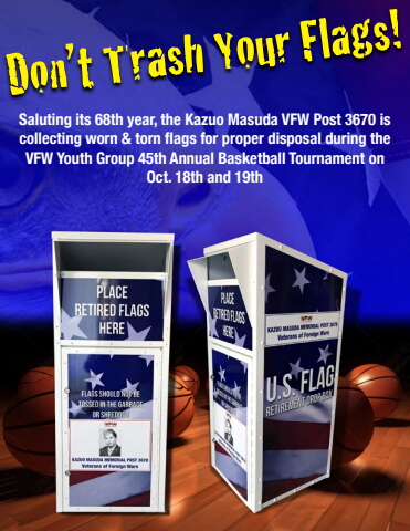 25Don%u2019t Trash Your Flag!Don%u2019t Trash Your Flags!Saluting its 68th year, the Kazuo Masuda VFW Post 3670 is collecting worn & torn flags for proper disposal during the VFW Youth Group 45th Annual Basketball Tournament on Oct. 18th and 19th