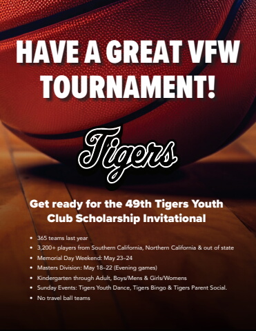 36%u2022 365 teams last year%u2022 3,200+ players from Southern California, Northern California & out of state%u2022 Memorial Day Weekend: May 23%u201324 %u2022 Masters Division: May 18%u201322 (Evening games)%u2022 Kindergarten through Adult, Boys/Mens & Girls/Womens%u2022 Sunday Events: Tigers Youth Dance, Tigers Bingo & Tigers Parent Social.%u2022 No travel ball teamsHAVE A GREAT VFW TOURNAMENT!Get ready for the 49th Tigers Youth Club Scholarship Invitational